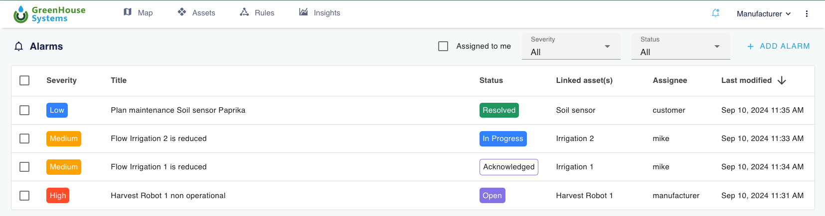 - Severity: High severity alarms are automatically emailed to the assigned person.
