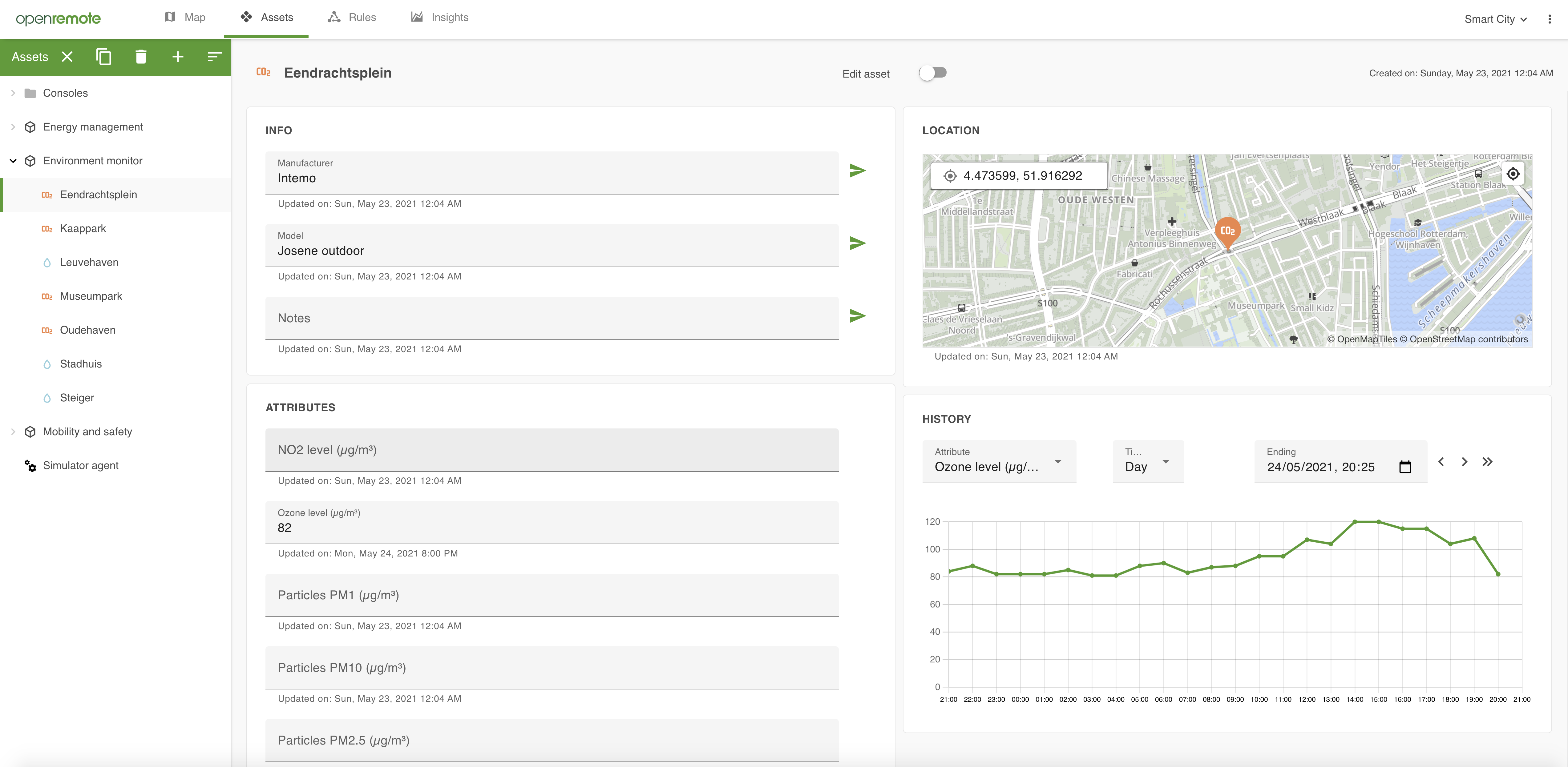 If you open the application you will get four main pages: Map, Assets, Rules, and Insights. In addition there are a series of Settings to interconnect managers, change language, edit your account, and create users, roles, or realms. Also the service users for the Manager APIs can be set here.