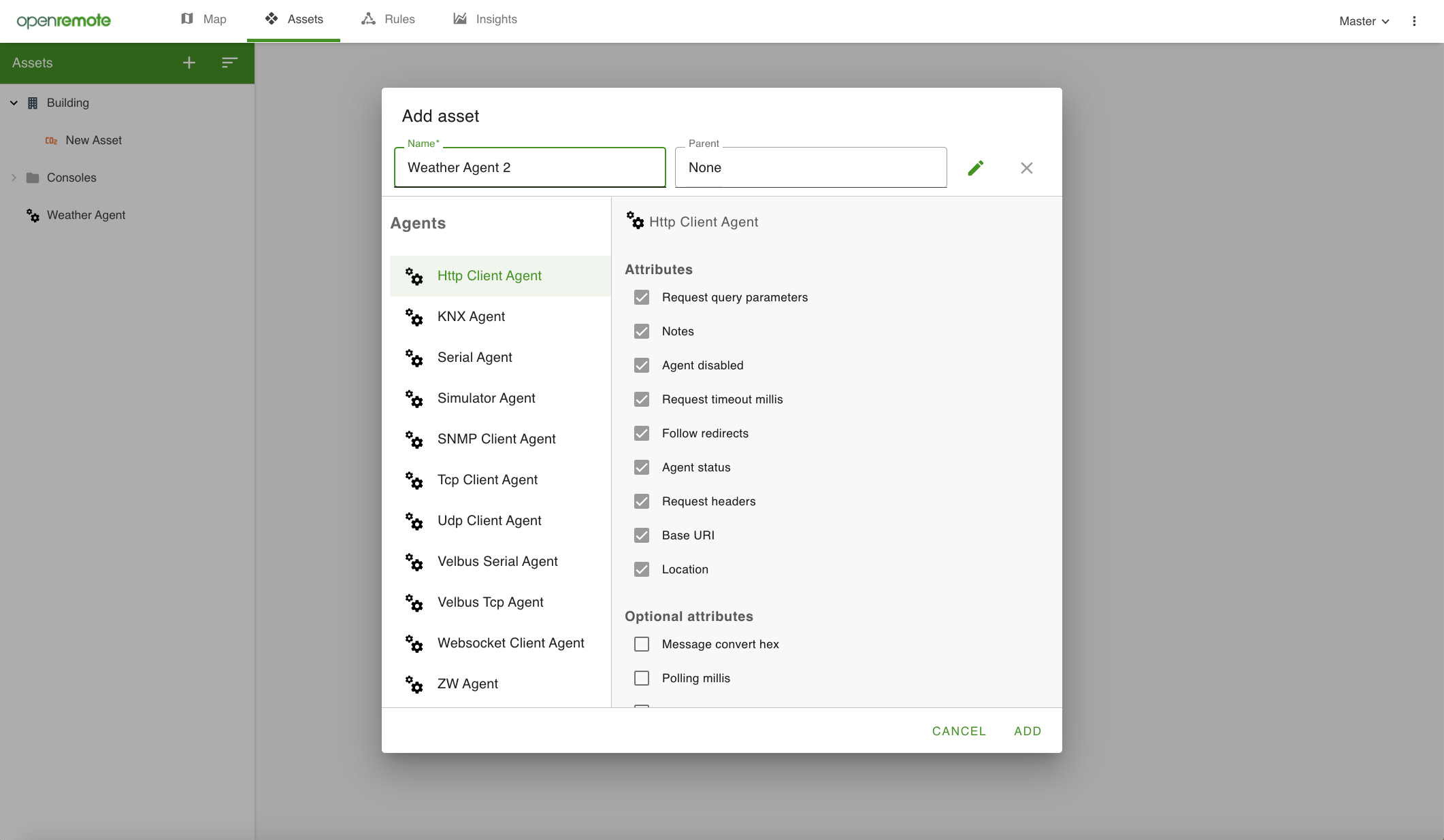 Agents are a specific type of asset used to connect to external sensors, actuators, gateways, or services using protocols. They are added in the same manner as assets by clicking the + in the header of the asset tree. This will open a modal that shows the available agent types at the top of the list. You will see the generic ones: HTTP, WebSocket, MQTT, TCP, UDP and SNMP; as well as more specific ones like Z-wave, KNX or Velbus.