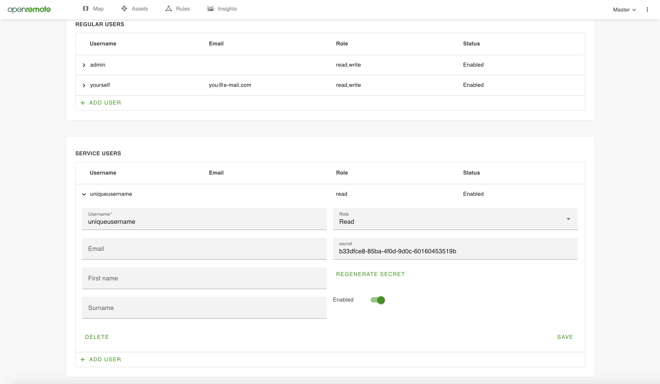 Figure 24. Creating service users, with Username, Secret and Roles for a selected Realm
