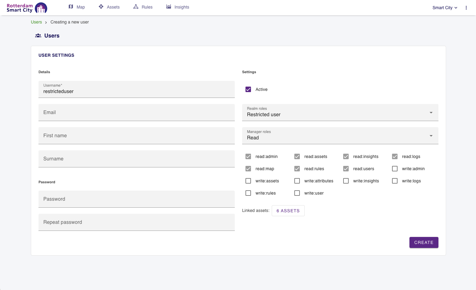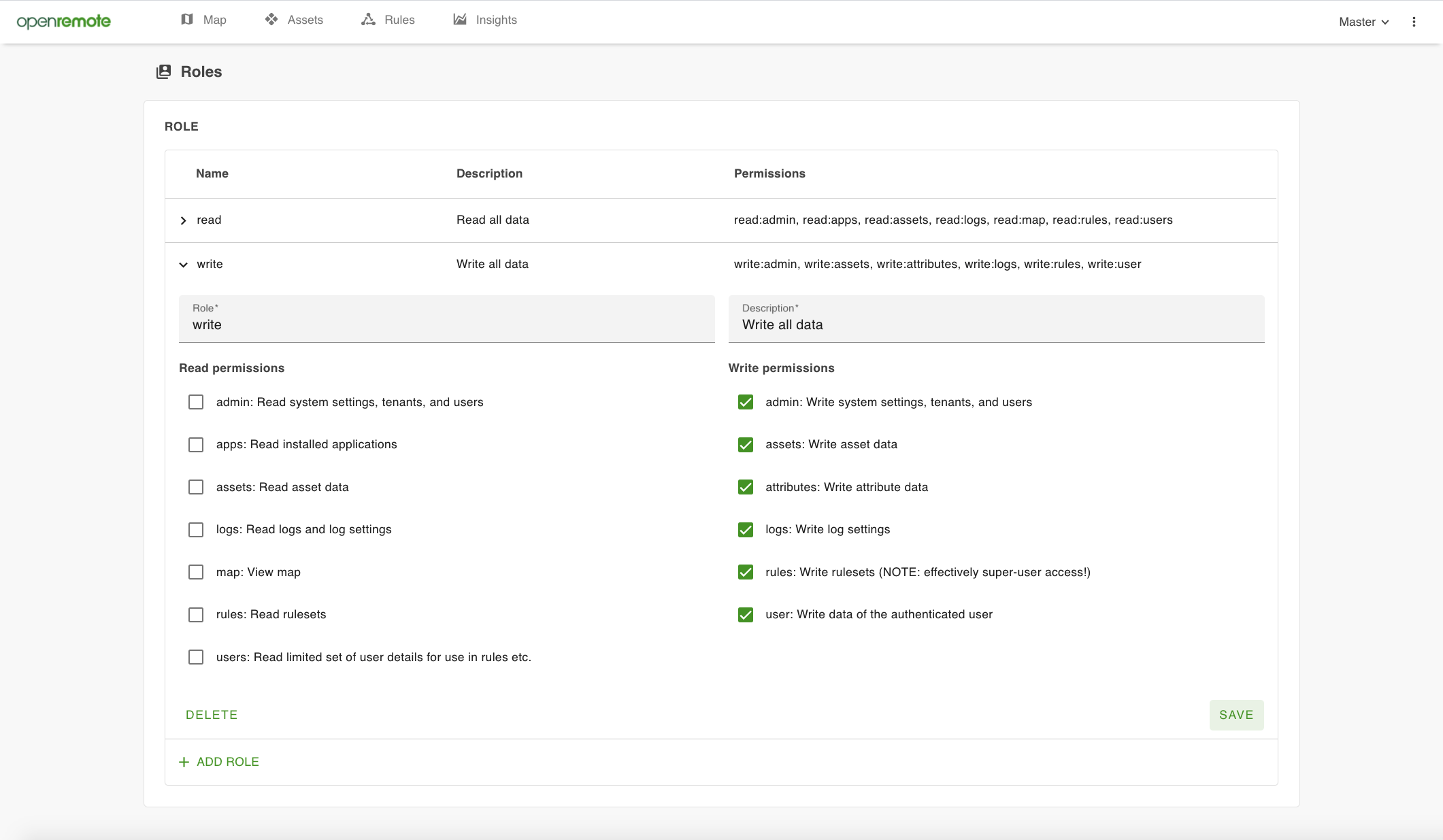 With the correct permissions, you can create and edit roles. These roles define which parts of the system a user is allowed to Read or Write, e.g. system settings, assets, attributes, map, or rules. Also see the userguide: Realms, users and roles.