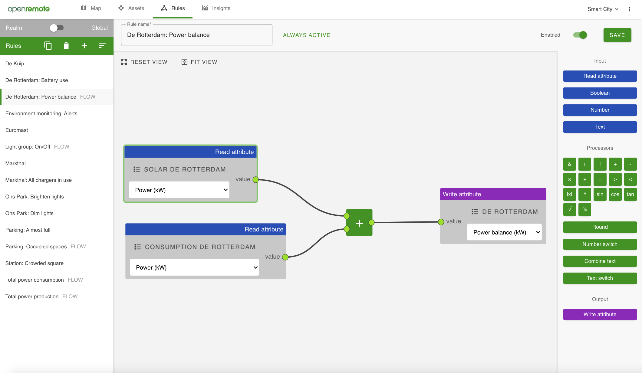 Flow rules can be used to fill (new) attributes with processed other attributes. In the visual editor you can use Input (blue), Processor (green), and Output (purple) nodes, and wire them up. See the Flow Rules documentation for more details.