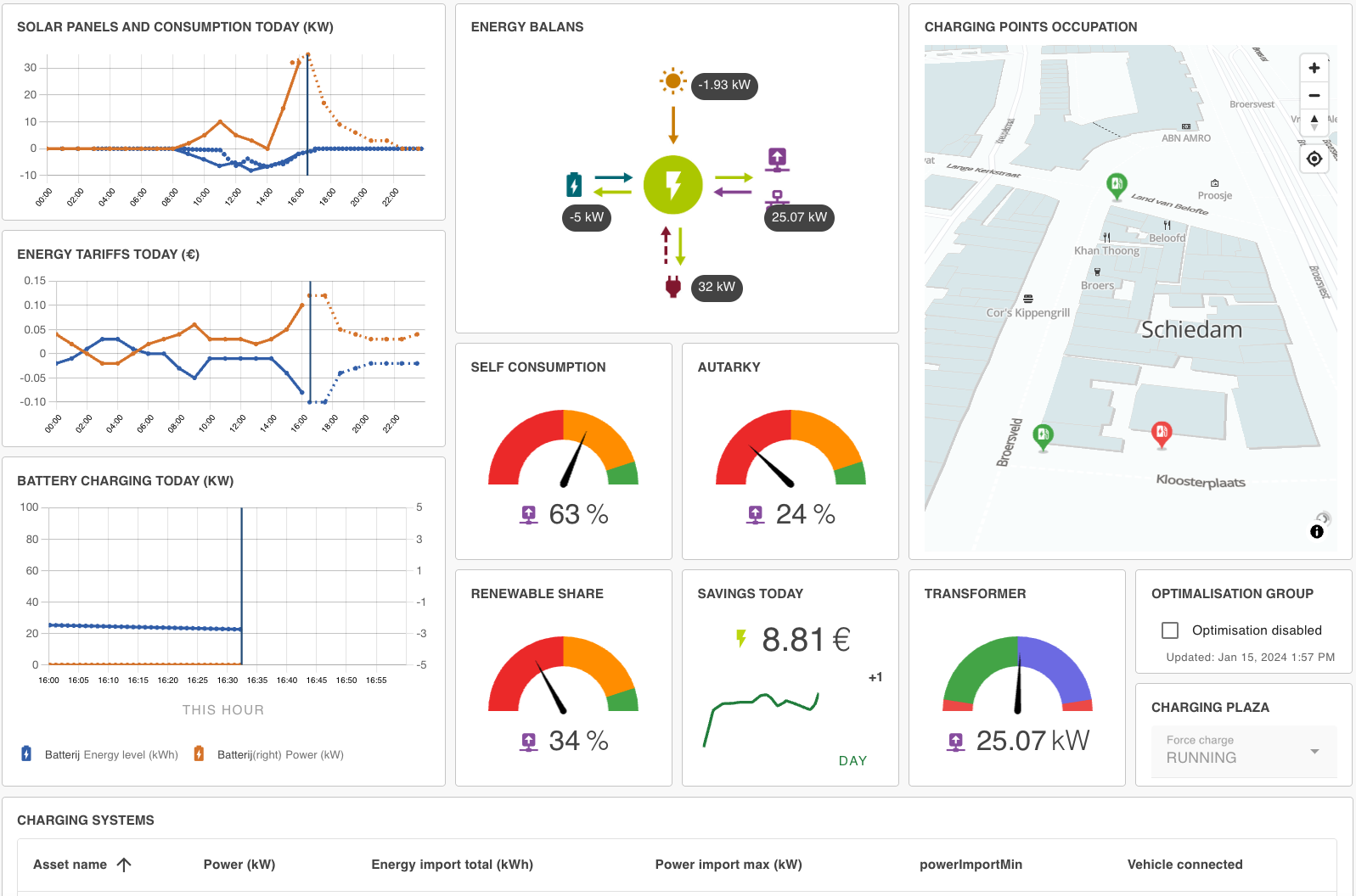 The alarms functionality (top right) allows you to automatically generate alarms, assign them to users, and track their status. You can also see an overview of alarms assigned to you, and high priority alarms are automatically send to assigned persons. These features are supported: