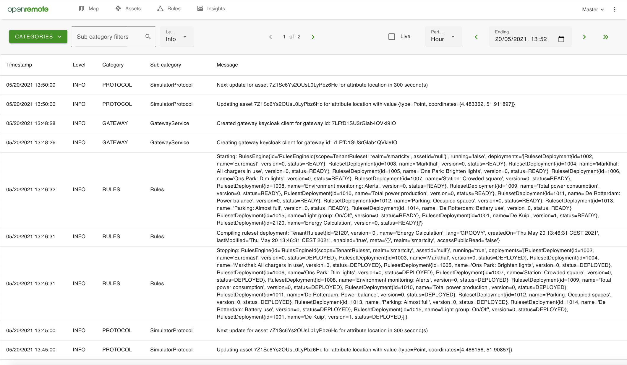 The logs page shows information, warnings and errors of the different activities of OpenRemote. You can use it to understand the behaviour of the whole platform or debug issues, e.g. errors connecting agent with device.