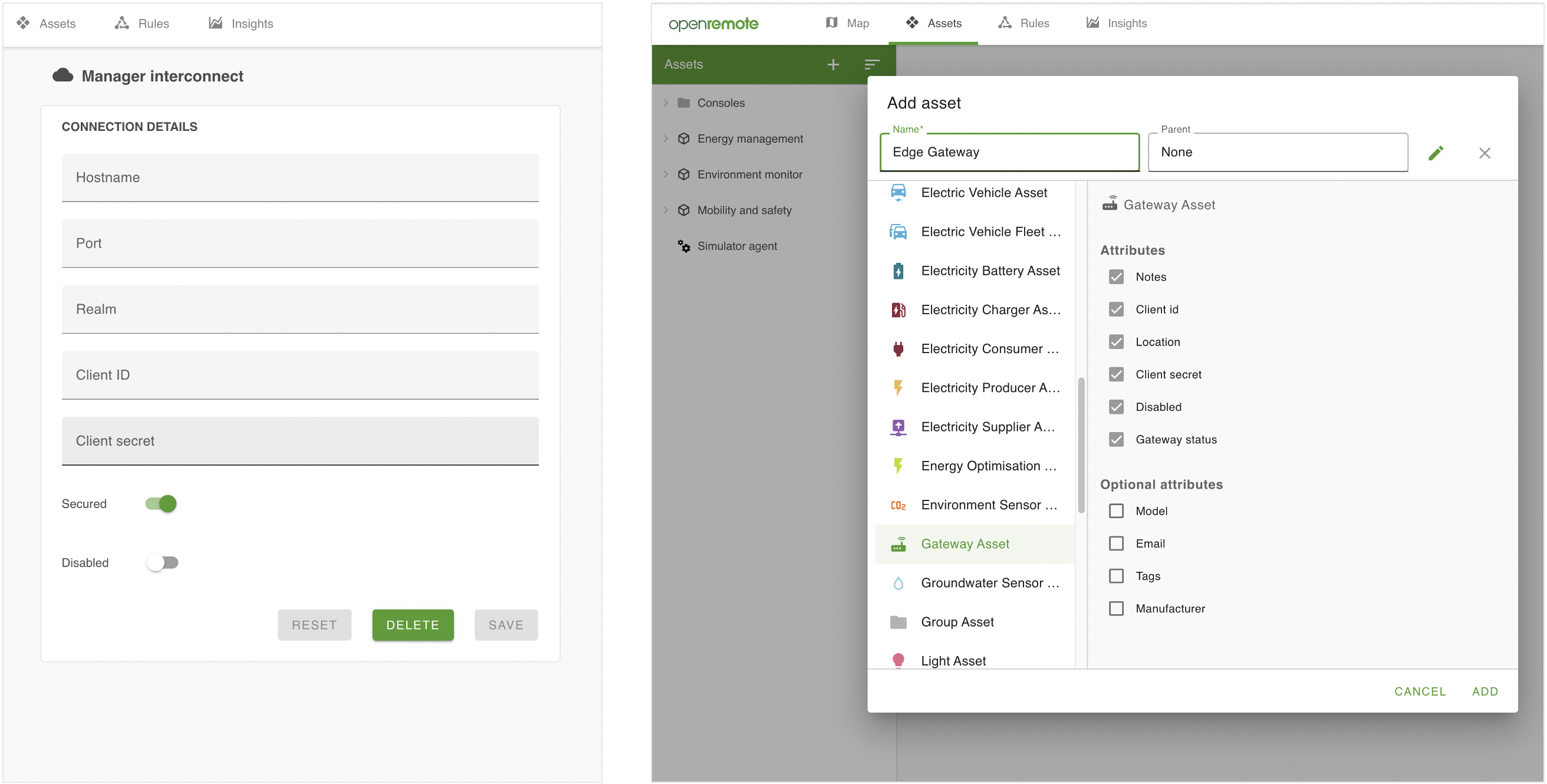 Figure 14. Several OpenRemote instances can be interconnected, e.g. connecting multiple instances on edge gateways to one central cloud hosted instance. The Manager Interconnect page, used at the edge instances (left) uses the keys which are created on the central instance by adding Edge gateway Assets (right).
