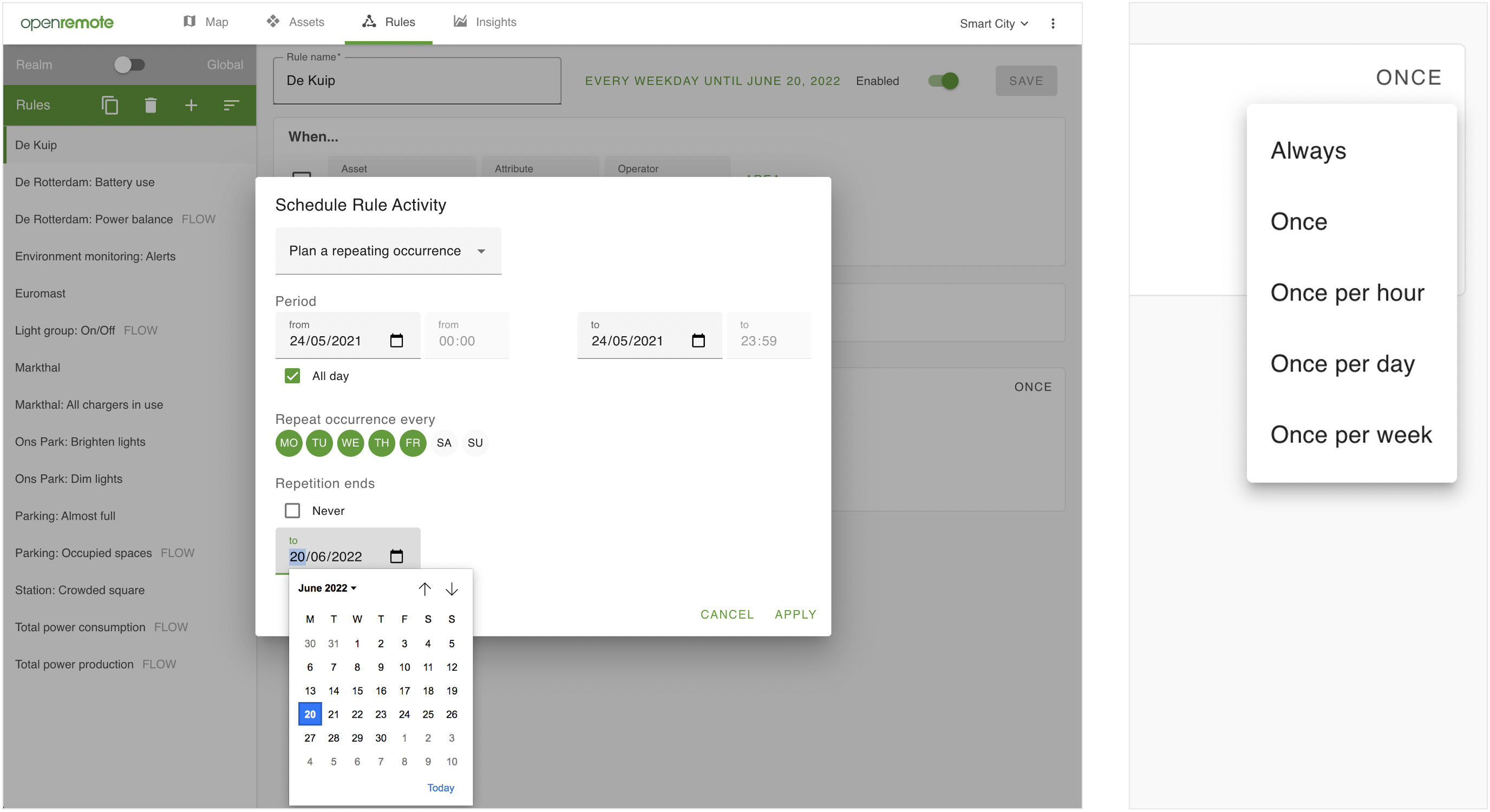 Figure 8. The Rules trigger frequency (right) as well as time scheduler (left) defines when rules are triggered and active. The scheduled example sets the rule to be active until June 20 2022, only on weekdays.
