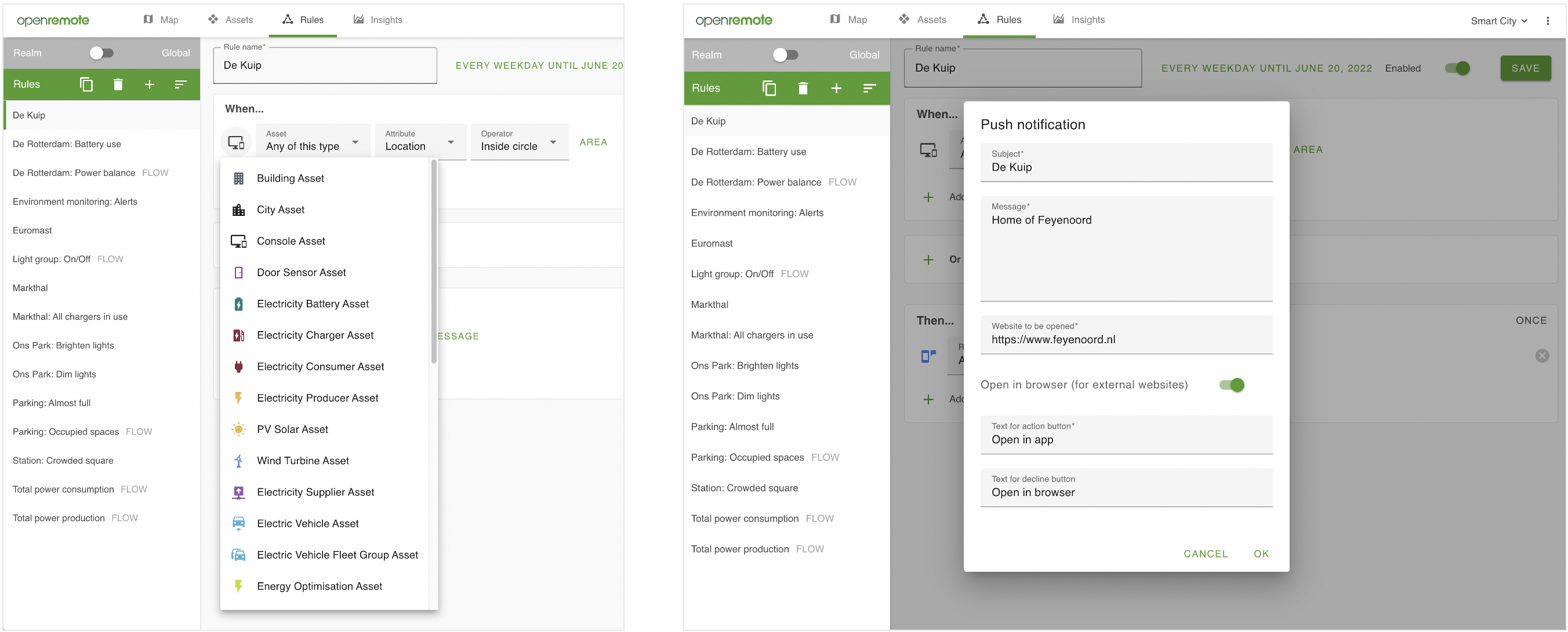 Figure 7. A When-Then example, which shows how, on the When-side an asset type can be selected, while on the Then-side the action, in this case a push notification, is defined.